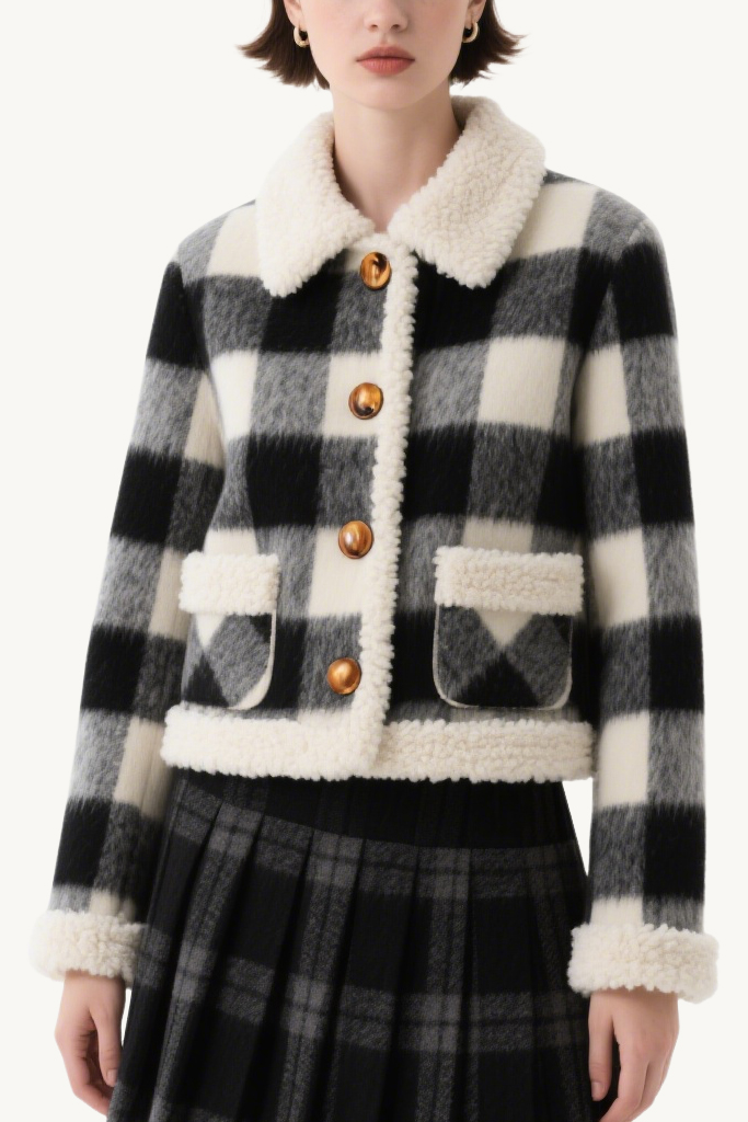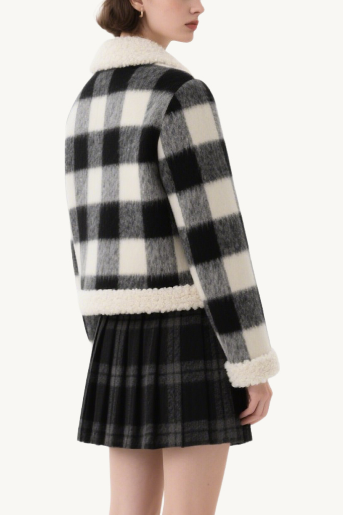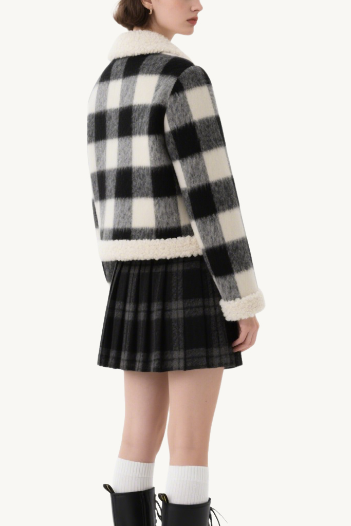 Women’s Black and White Plaid Faux Shearling Collar Jacket