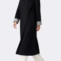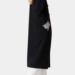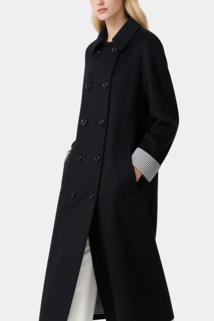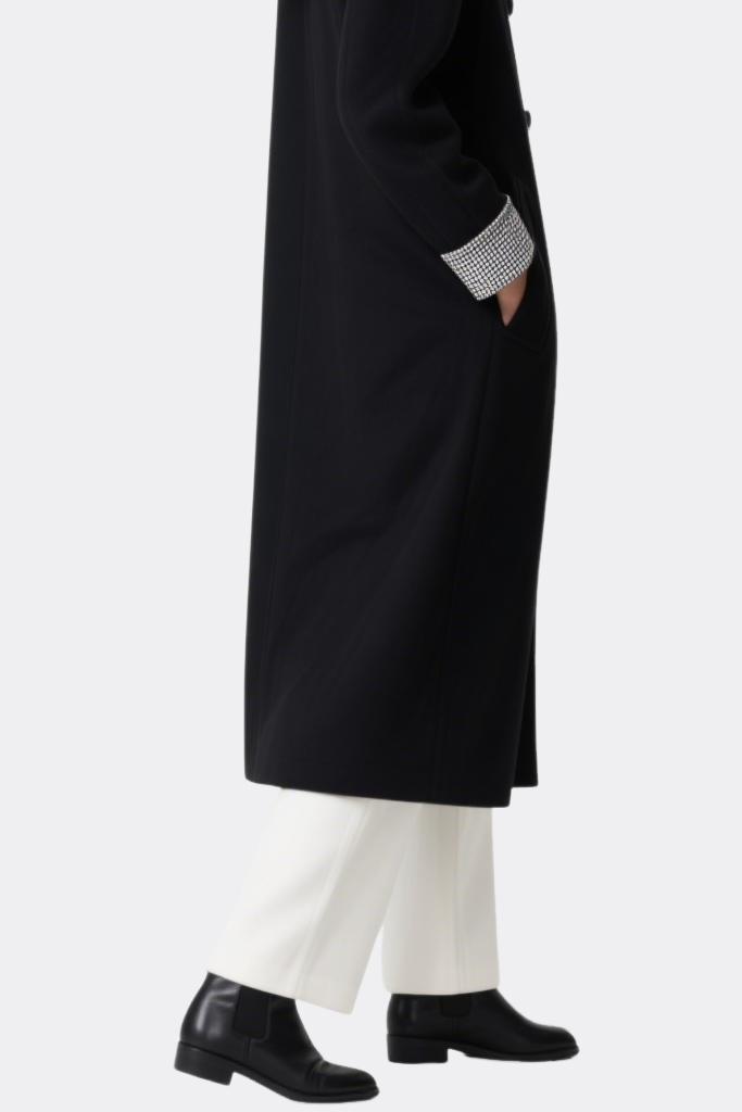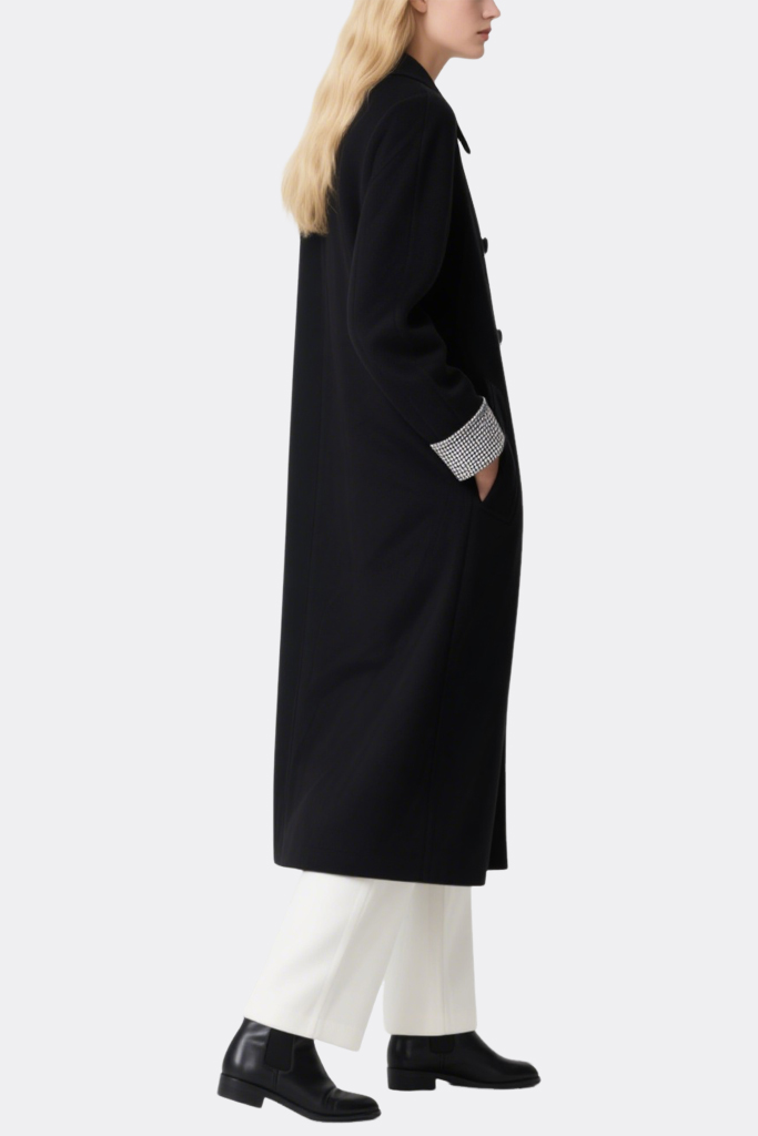 Women’s Black Double Breasted Long Coat with Checked Cuffs