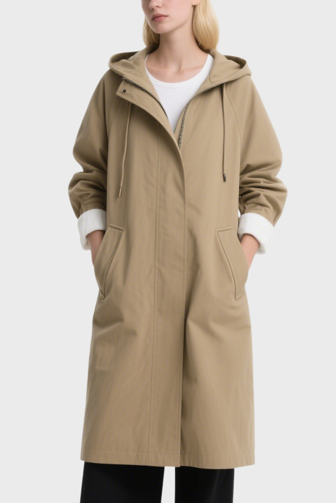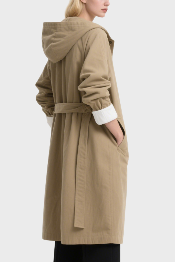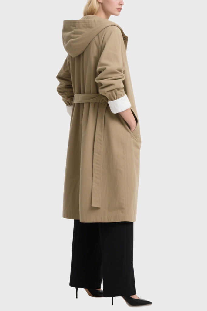 Women’s Camel Hooded Trench Coat with Fleece Cuffs